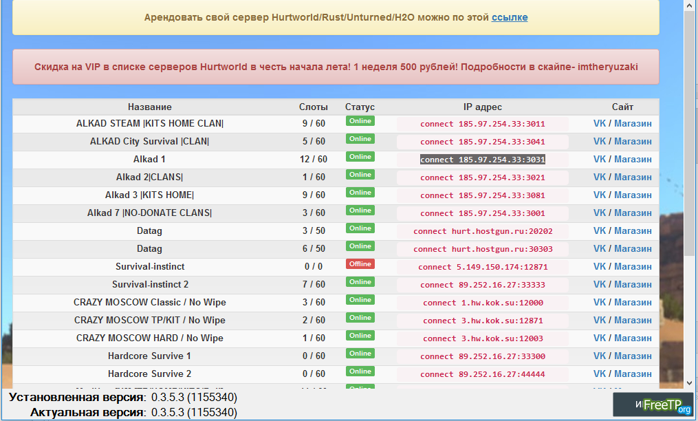 Как создать сервер: 3.*) Создаем копию игры (или устанавливаем дополнительный клиент в другую папку, к примеру Hurtworld Server) => Копируем все файлы из папки Dedicated Server в корень папки с игрой и заменяем все совпадения => Multiplayer => Host Server => Выбираем режим и карту, жмём Create Session => Находясь в лобби зовём друзей и ожидаем других игроков. 3.1) Запускаем файл Create Server и дожидаемся запуска сервера (примерно 20 секунд, на экране появится консоль, просто ждём.) => сообщаем друзьям IP вашей локальной сети (или тангла). 4.2) Чтобы зайти на свой сервер прописываем Сервера на которых можно поиграть: