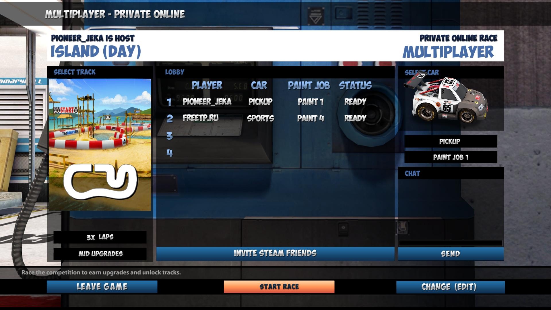 - 1) Multiplayer => Host Private Game => Выбираем настройки игры и отправляем приглашение (сворачиваем игру, кнопкой Alt+Tab или Win, входим в стим и кидаем приглашение другу) => Ждем когда все игроки будут готовы, Указываем Свою готовность кнопкной Ready => Start Race.
