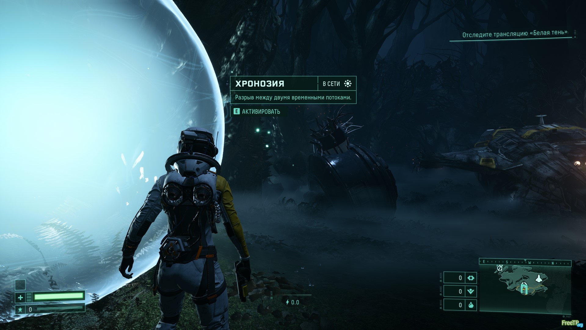 2.* проходим обучение и подходим к синему шару "Хронозия" (слева от корабля) => E =>